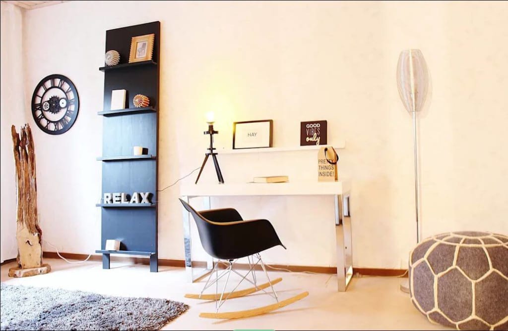 Những người thú vị luôn biết cách mang điều đó đến mọi ngóc ngách cuộc sống của họ ngay cả ở nơi nghiêm túc nhất như bàn làm việc. Ghế tựa kiểu bập bênh những trang trí độc đáo và cả những màu sơn trung tính theo gam ấm như hồng, vàng cam,… khiến góc làm việc này như một nơi thư giãn vậy.