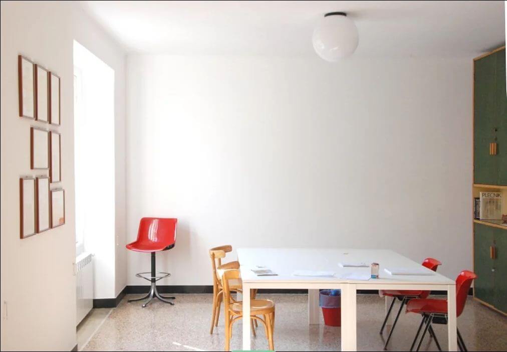 Nếu bạn là một nhà thiết kế cần một mặt phẳng rộng tương đối và không gian cho các đồng đội cùng tác nghiệp. Sẽ thật tuyệt vời khi bạn lựa chọn một nơi thuần màu trắng và thêm những đốm đỏ trên dãy ghế ngồi.