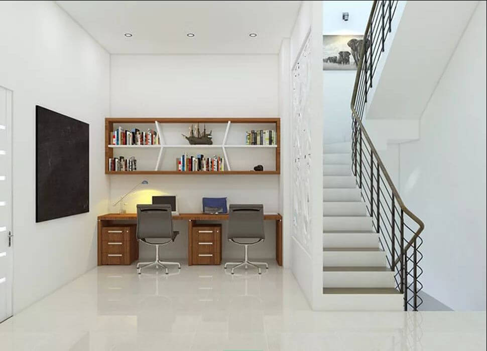 Với những ngôi nhà hạn chế về diện tích thì việc tận dụng những góc nhỏ bên cầu thang làm góc học tập cho 2 người là điều không tồi. Ở các thiết kế tương tự, điều bạn cần làm là giữ cho mọi thứ sự ngăn nắp và khoa học. Có thêm một cái đầu cùng suy nghĩ khi khó khăn, chia sẻ lúc mệt mỏi sẽ khiến công việc trở nên dễ chịu hơn.