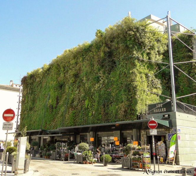 Chợ Les Halles ở Avignon (Pháp) thu hút du khách bằng bức tường hơn 600m2 ở mặt tiền phía bắc chợ khi mỗi mét vuông tường là 20 cây cỏ và điểm xuyết những bông hoa đủ màu.