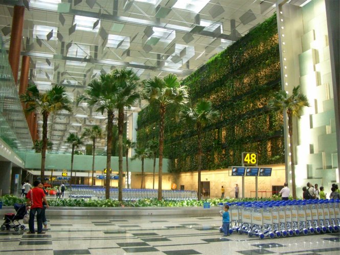 Không gian xanh tràn ngập giúp nhiều du khách mất cảm giác bực bội khi phải chờ nhiều giờ liền cho chặng bay chuyển tiếp ở Nhà ga số 3 của sân bay Changi tại Singapore. Hai bức tường xanh tại nhà ga thường xuất hiện trong các bức ảnh lưu niệm của du khách…